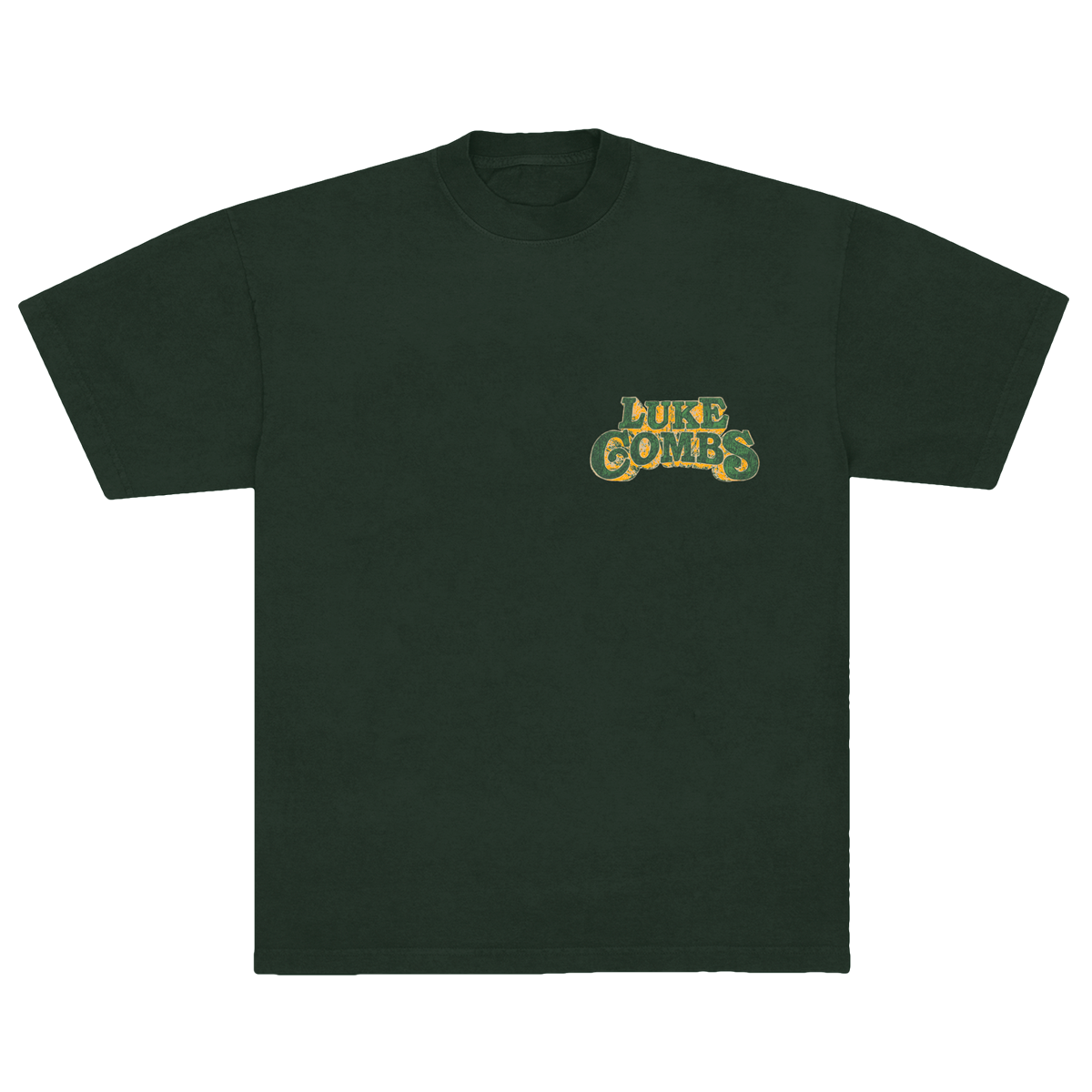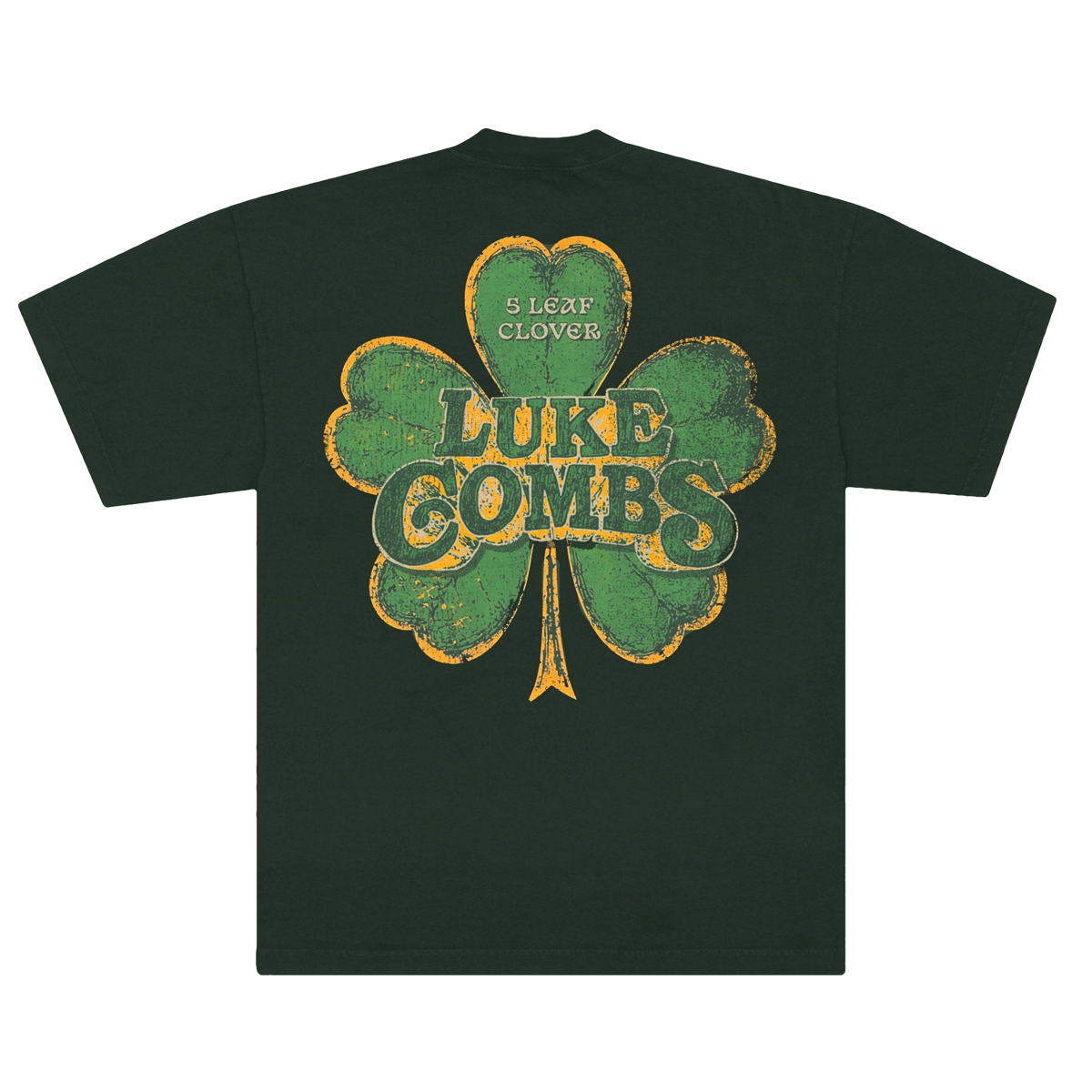 A DARK GREEN UNISEX TEE WITH GRAPHIC DESIGN INSPIRED BY "5 LEAF CLOVER", FEATURING LUKE COMBS LOGO ON THE FRONT AND CLOVER DESIGN ON THE BACK.