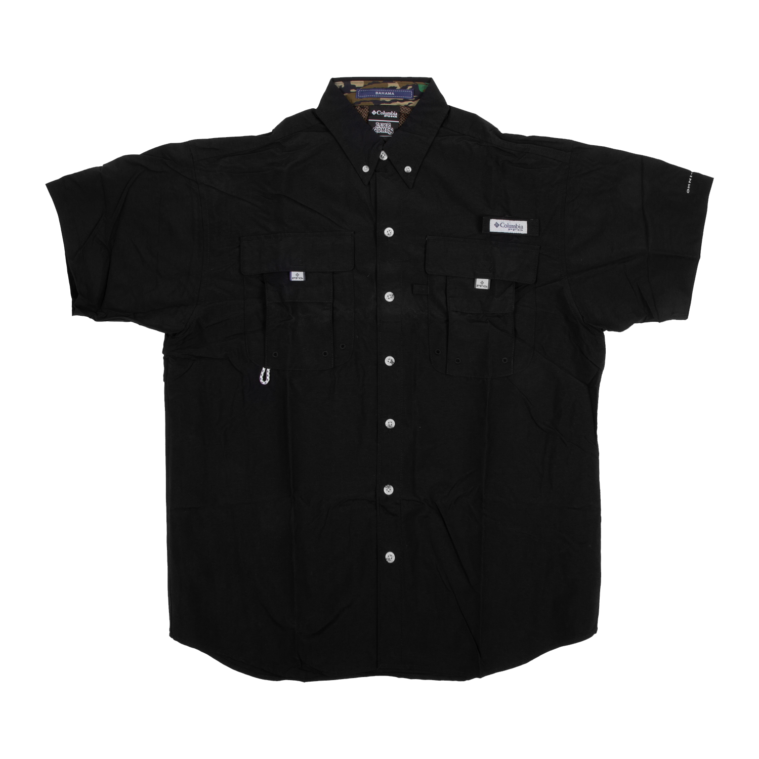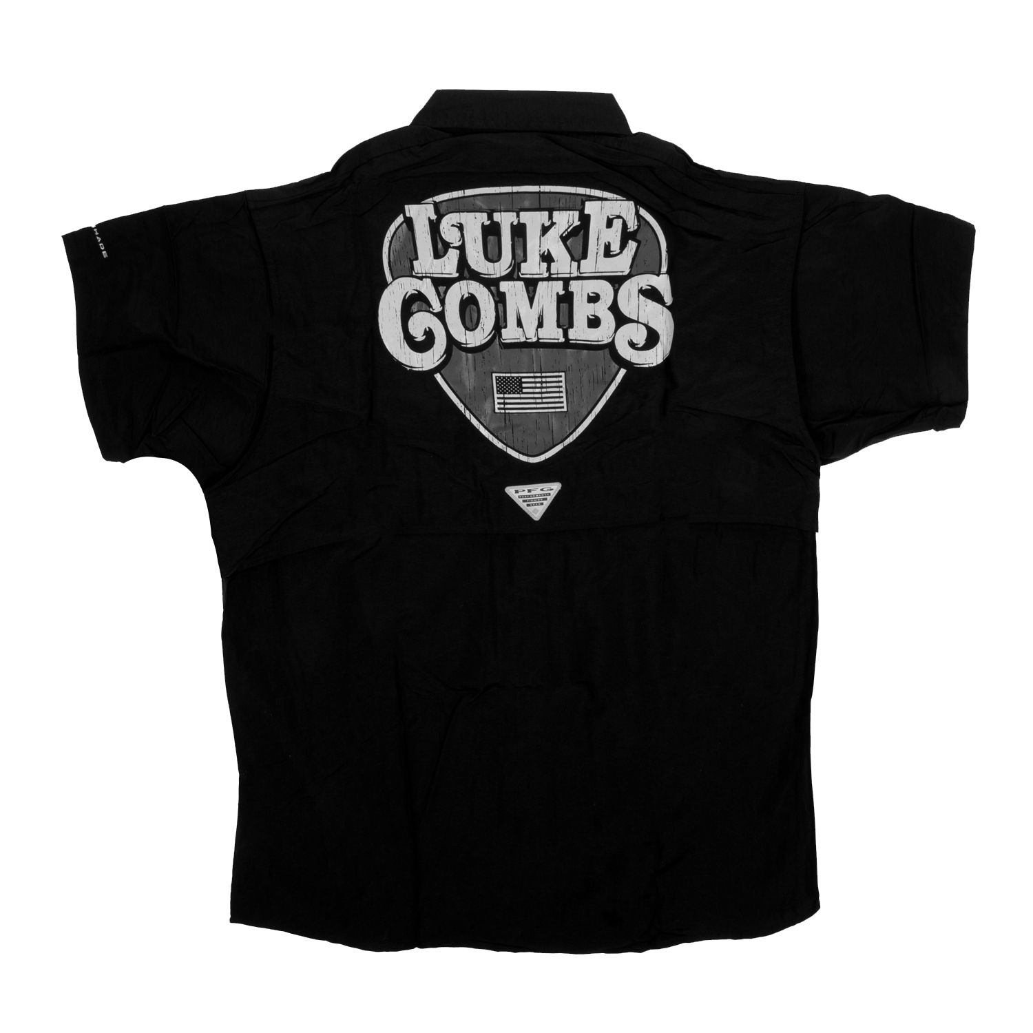 A Columbia short sleeve button down with Luke Combs logo design printed on the back.