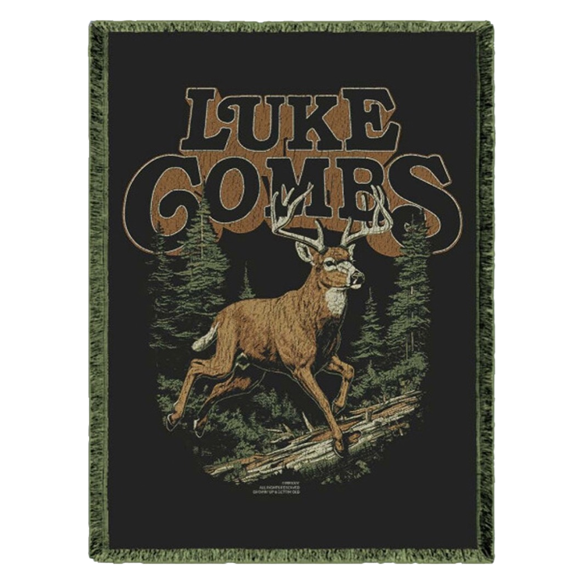A woven blanket with Luke Combs deer graphic on the front.