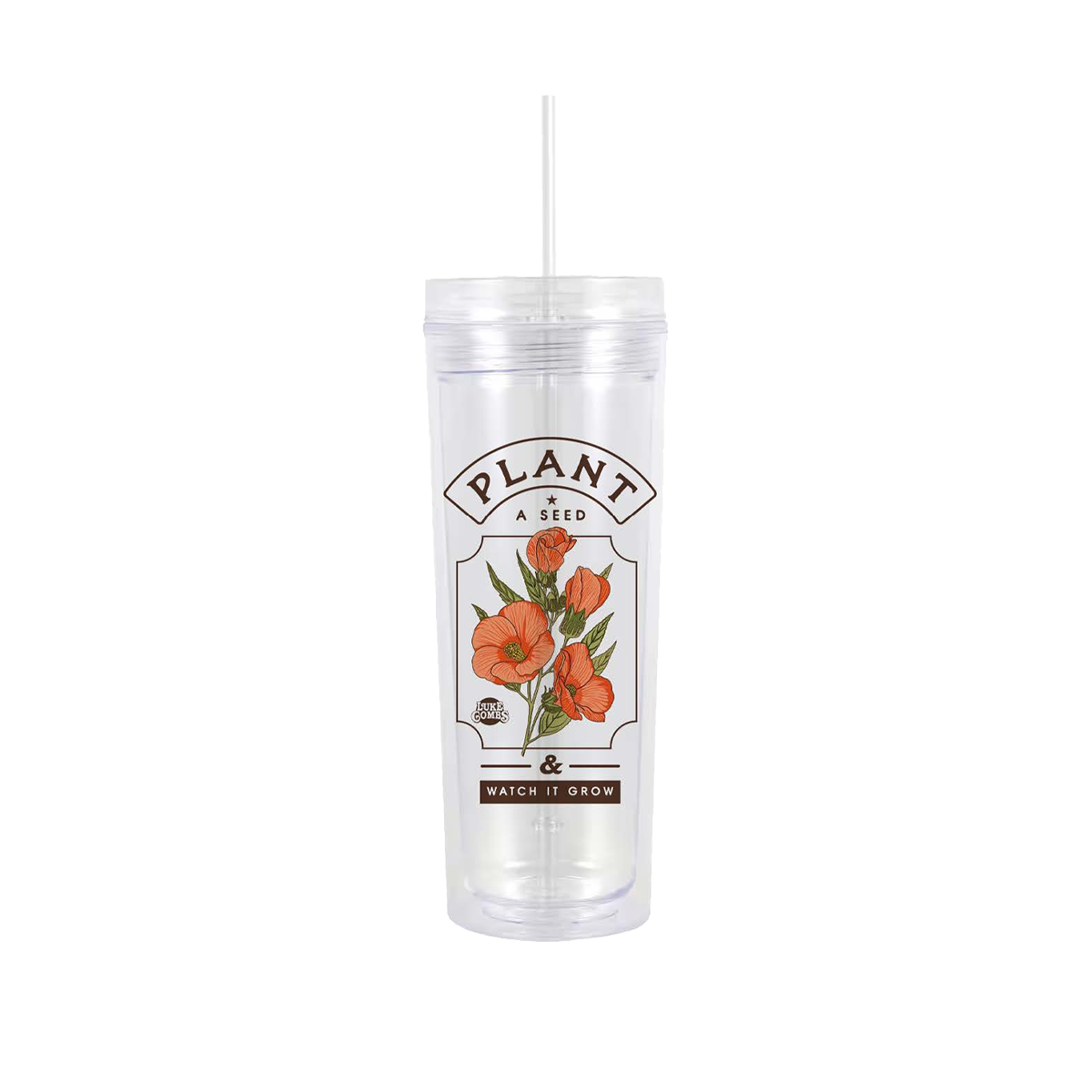 A frosted white tumbler with 'Plant A Seed' design on the front.
